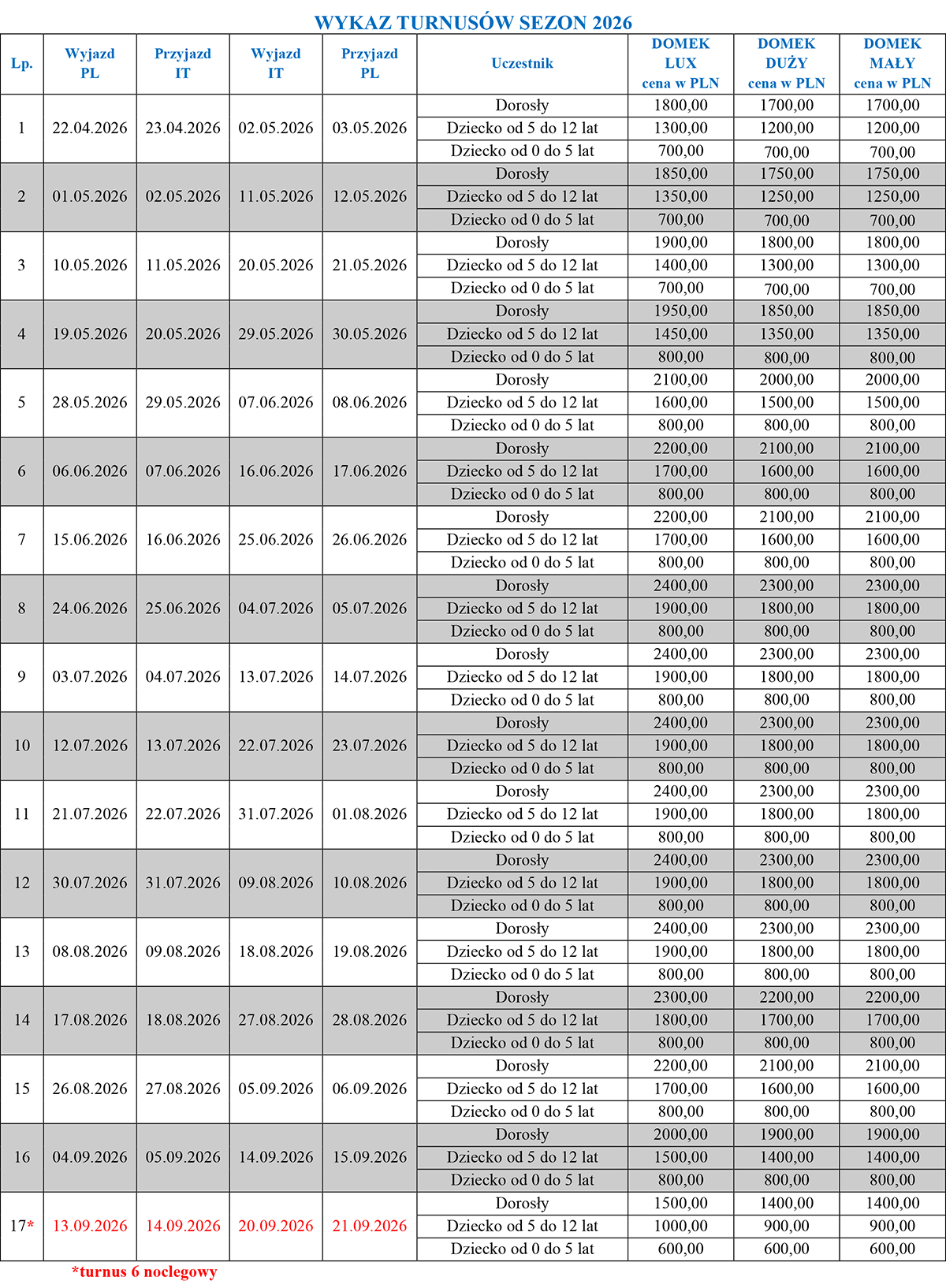 - wyjazd z Polski w godzinach ok. 16:00 – 20:00, przyjazd do Włoch w godzinach ok. 10:00 – 12:00